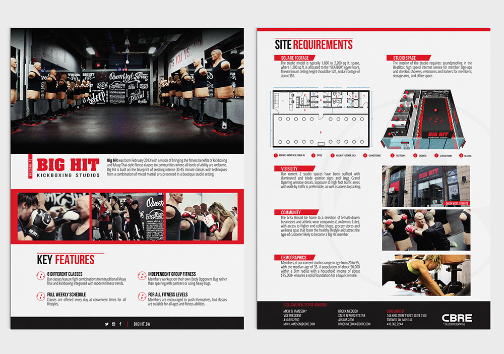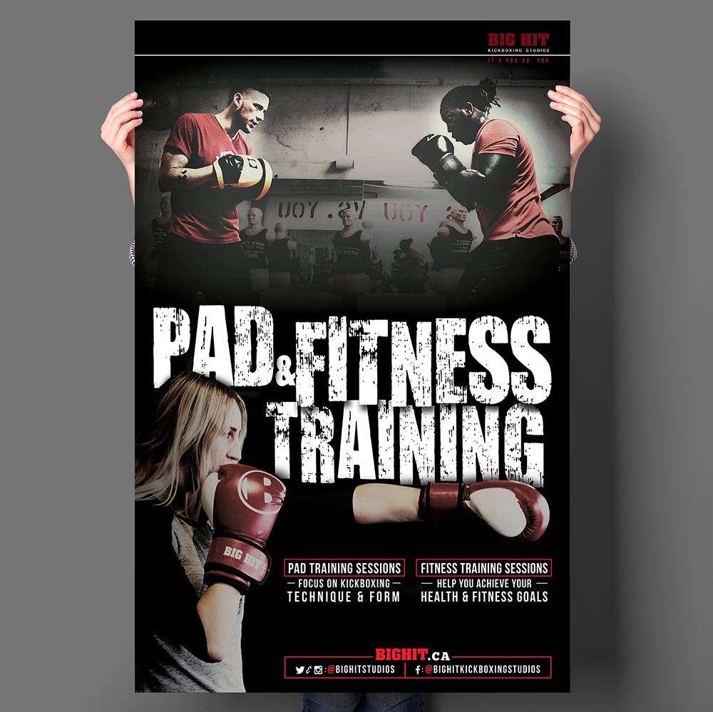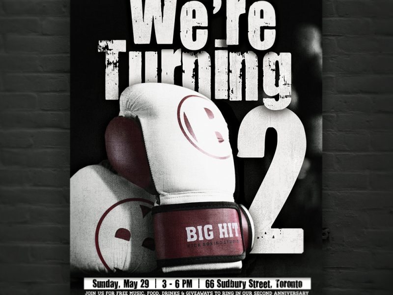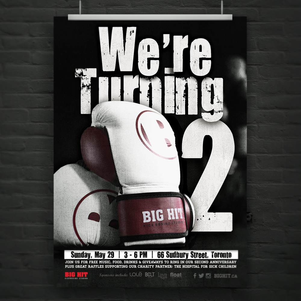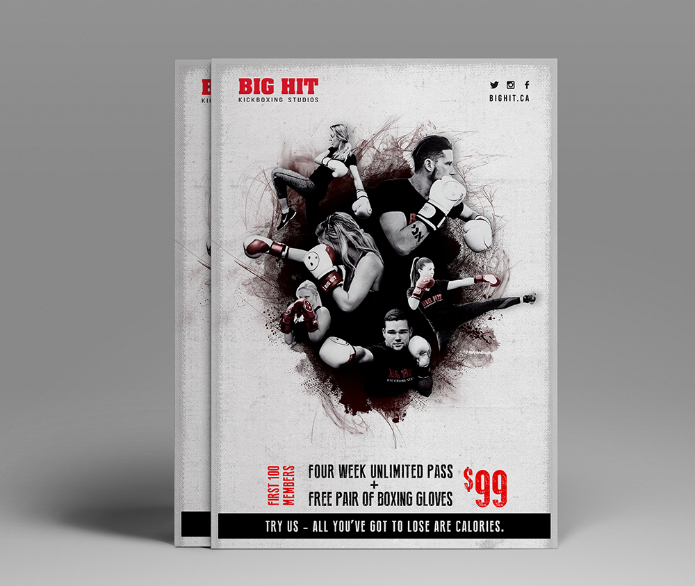 Big Hit Kickboxing Studios is a boutique-style kickboxing studio located in Toronto and Oakville. I originally started out as a member there before coming on board to take on graphic design and manage the branding direction for the company. The logo, icon, colour scheme and interior aesthetic for the studio locations had already been implemented. Much of my role includes maintaining consistency between branded promotional items (flyers, posters, business cards) while also pushing the envelope to ensure the company is seen as being unique, fresh, welcoming and intriguing.